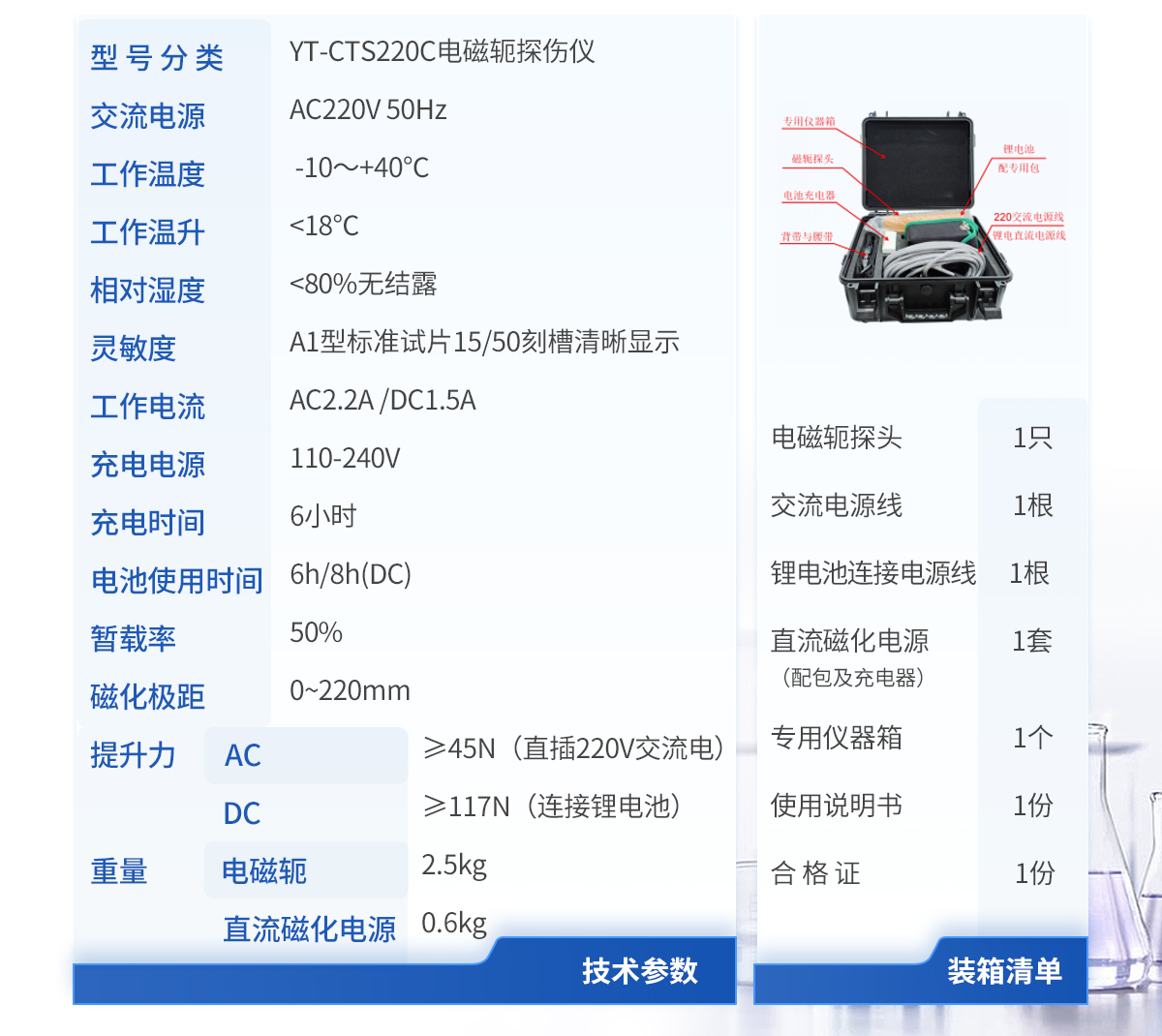 | 型 號 分 類:YT-CTS220C電磁軛探傷儀 | 交流電源:AC220V 50Hz | 工作溫度:-10~+40℃ | 工作溫升:<18℃> | 相對濕度:<80%無結露> | 靈敏度:A1型標準試片15/50刻槽清晰顯示 | 工作電流:AC2.2A /DC1.5A | 充電電源:110-240V | 充電時間:6小時 | 電池使用時間:6h/8h(DC) | 暫載率:50% | 磁 化 極 距:0~220mm | 提升力:A C ≥45N(直插220V交流電) | 重量: (1)電磁軛:2.5kg (2)直流磁化電源(鋰電池):0.6kg |