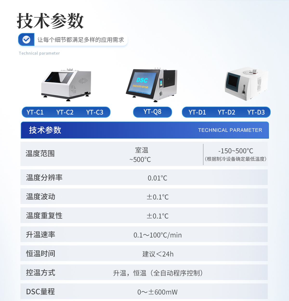 1.溫度范圍: 室溫~500℃    2.溫度分辨率: 0.01℃    3.溫度波動: ±0.1℃    4.溫度重復性: ±0.1℃    5.升溫速率: 0.1~100℃/min    6.恒溫時間:建議<24h    7.控溫方式:升溫,恒溫(全自動程序控制)    8.DSC量程: 0~±600mW    9.DSC解析度: 0.01mW    10.DSC靈敏度: 0.01mW    11.工作電源: AC220V/50Hz或定制    12. 氣氛控制氣體:氮氣、氧氣(儀器自動切換)    13.氣體流量:0-300mL/min    14.氣體壓力:0.2MPa    15.顯示方式: 8寸 LCD觸摸屏顯示,超硬度儀器面膜設計。