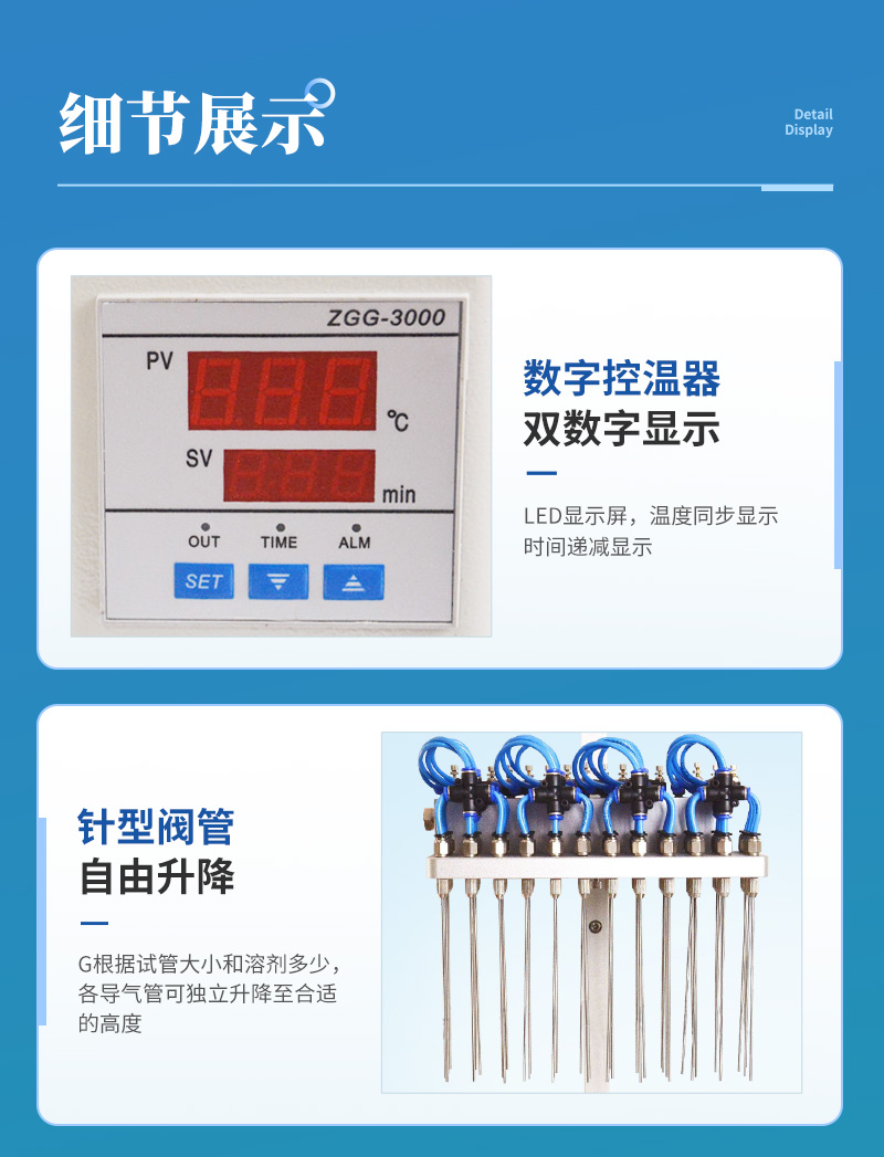 4.自由升降的針型閥管,根據試管大小和溶劑多少,各導氣管可獨立升降至合適的高度,同時可調的針型閥能管控制氣體流量。