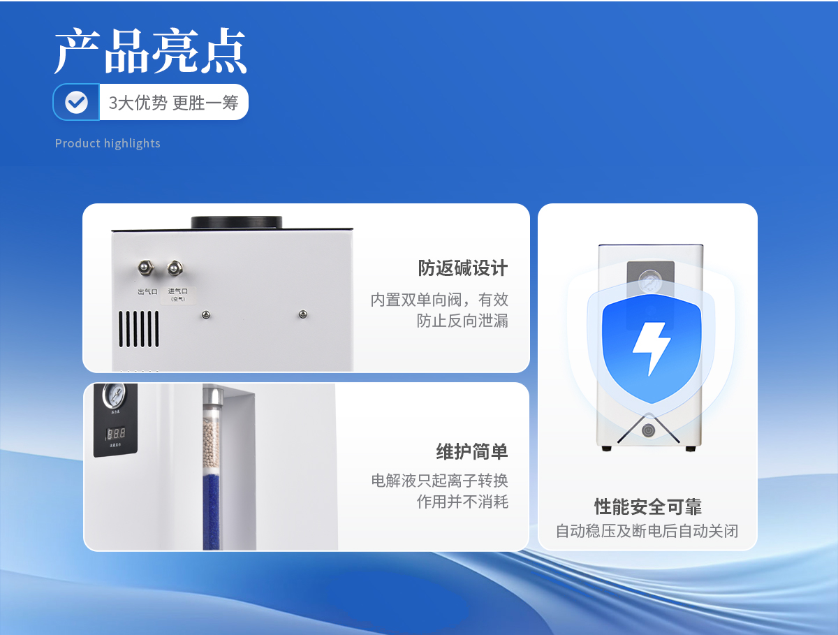 1. 壓力、流量自動顯示,自動恒壓、恒流,氮氣流量可根據用量實現全自動調節。    2. 不銹鋼過濾器,儀器內部采用硅橡膠圈(含硫量低),有效提高氣體質量,保證色譜基線平穩。    3. 配有安全裝置,靈敏可靠,自動防返堿。