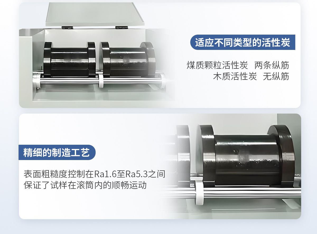 活性炭強度測定儀儀按照規定的試驗條件,將活性炭試料置于裝有鋼球的滾筒中,開啟強度測定儀,開始計時,通過滾筒的機械運動,試料被磨損,測定被破壞試料粒度的變化情況,用保留在試驗篩上的試料質量占原試料的質量分數,可求出活性炭試樣的強度。