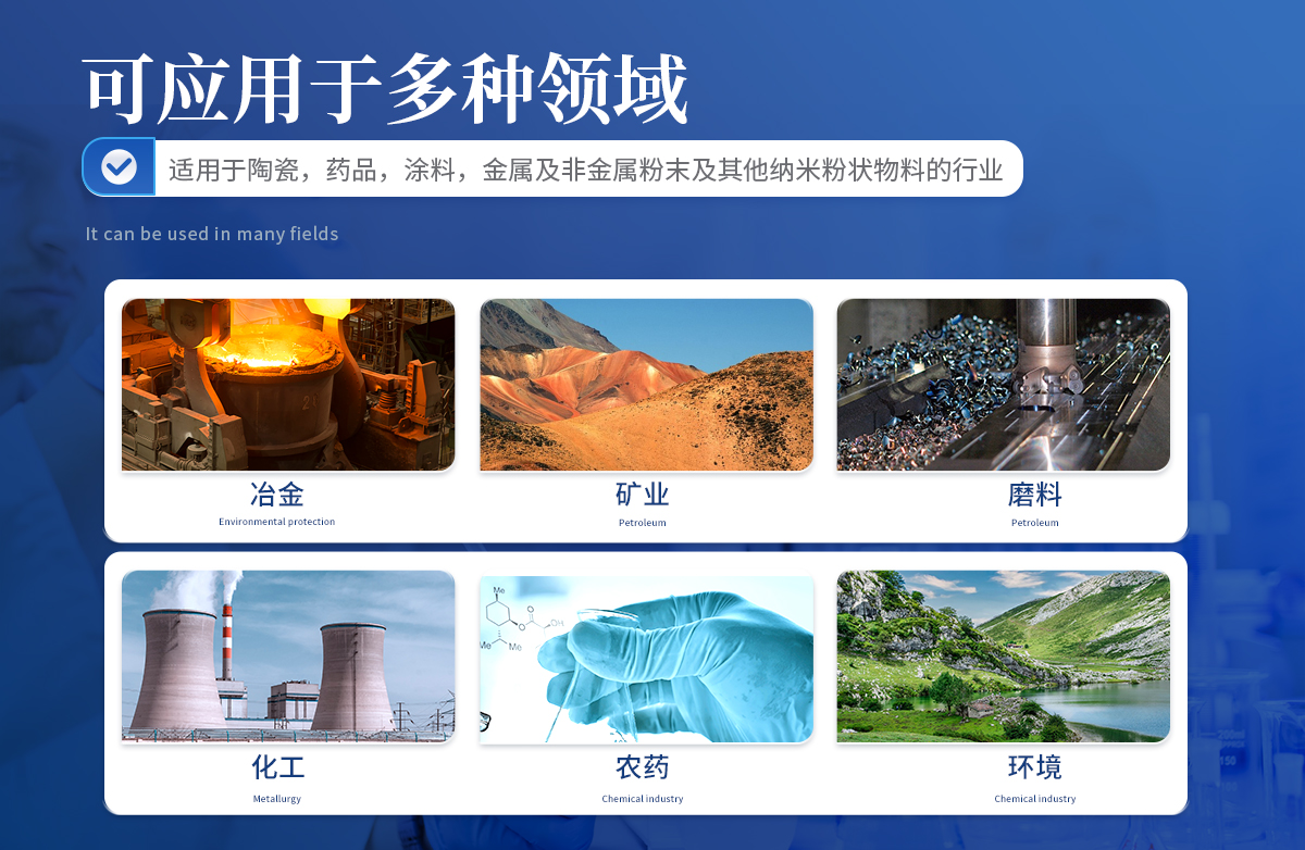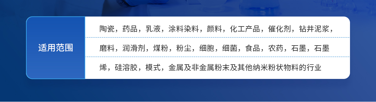 醫藥、食品、化工、磁性材料、水泥、涂料、農藥、核化工、電子、電池材料、造紙、冶金、陶瓷、建材、化妝品、磨料、金屬與分金屬粉末、氧化鋁、稀土、硬質合金、催化劑、發泡劑、耐火材料、填料、顏料等各種行業粉料的粒度測試。