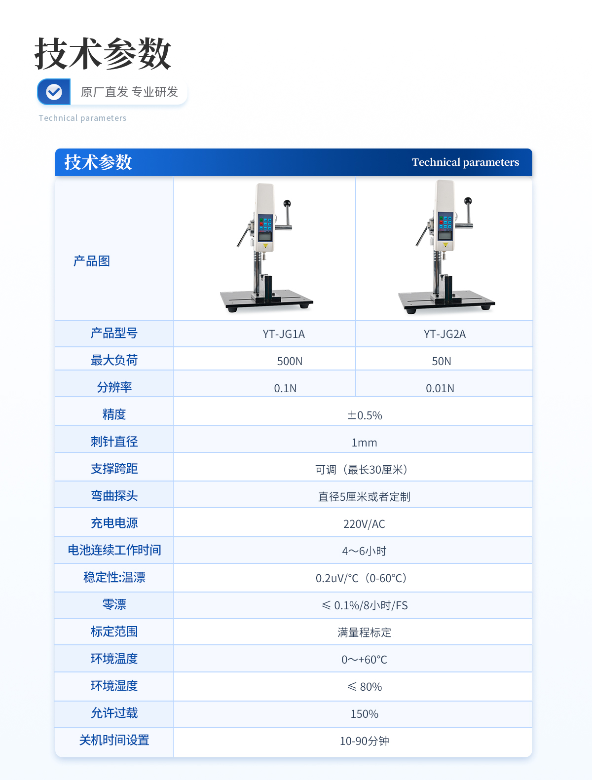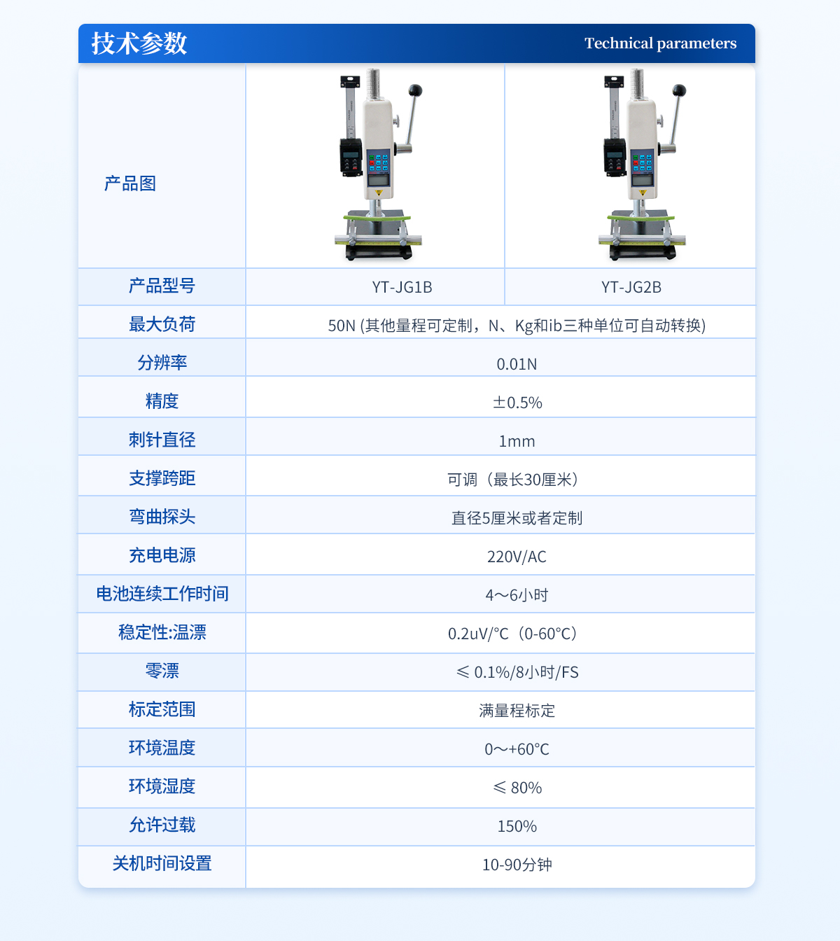| **負荷:50N (其他量程可定制,N、Kg和ib三種單位可自動轉換) | 分辨率:0.01N | 精度:±0.5%; | 刺針直徑:1mm | 支撐跨距:可調(*長30厘米) | 彎曲探頭:直徑5厘米或者定制 | 充電電源:220V/AC; | 電池連續工作時間:4~6小時; | 穩定性:溫漂:0.2uV/℃(0-60℃); | 零漂:≤ 0.1%/8小時/FS; | 標定范圍:滿量程標定; | 環境溫度:0~+60℃; | 環境濕度:≤ 80%; | 允許過載:150%; | 關機時間設置:10-90分鐘。 |