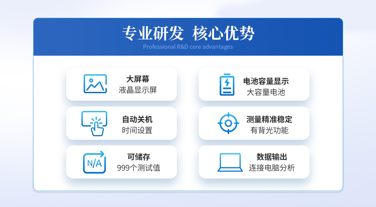 | 1、三種不同測頭:可進行莖桿彎折性能測量、莖稈抗壓強度測量、莖桿組織結構(穿刺)強度測量;彎折支架距離可調,并標有刻度。 | 2、可配測位移標尺 | 3、可連接電腦測試,可保存、打印,做各種分析,輸入速度、面積還可顯示位移、壓強等參數; | 4、可儲存999個測試值; | 5、大屏幕液晶顯示,有背光功能,并具有屏幕數字正、倒反轉功能; | 6、自動關機時間設置; | 7、電池容量顯示,電量過低自動關機。 |