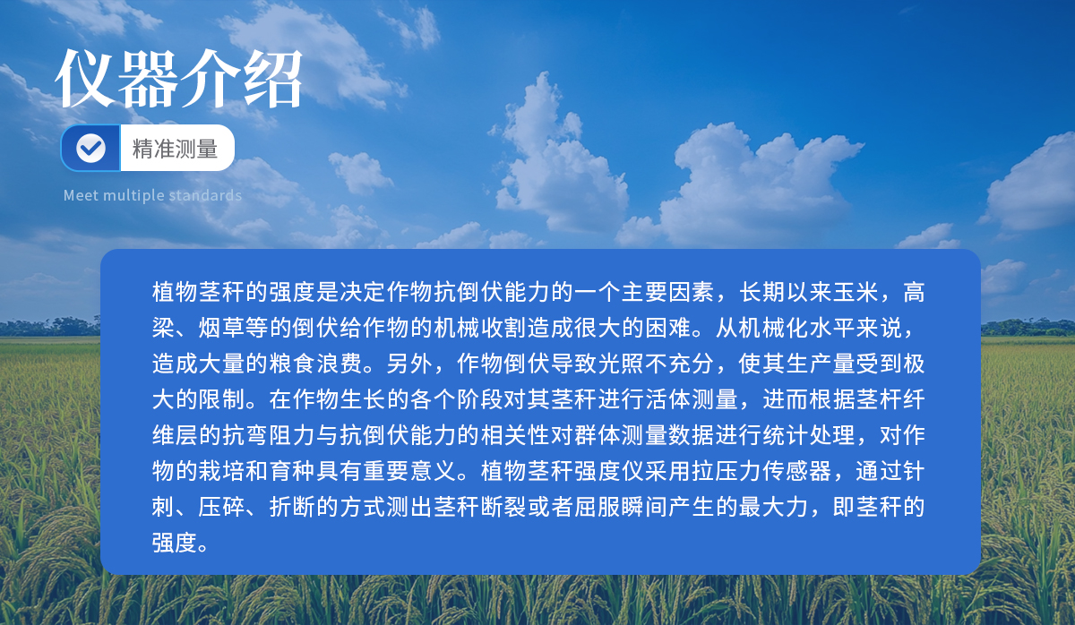 植物莖稈的強度是決定作物抗倒伏能力的一個主要因素,長期以來玉米,高梁、煙草等的倒伏給作物的機械收割造成很大的困難。從機械化水平來說,造成大量的糧食浪費。另外,作物倒伏導致光照不充分,使其生產量受到極大的限制。在作物生長的各個階段對其莖稈進行活體測量,進而根據莖桿纖維層的抗彎阻力與抗倒伏能力的相關性對群體測量數據進行統計處理,對作物的栽培和育種具有重要意義。植物莖稈強度儀采用拉壓力傳感器,通過針刺、壓碎、折斷的方式測出莖稈斷裂或者屈服瞬間產生的**力,即莖稈的強度