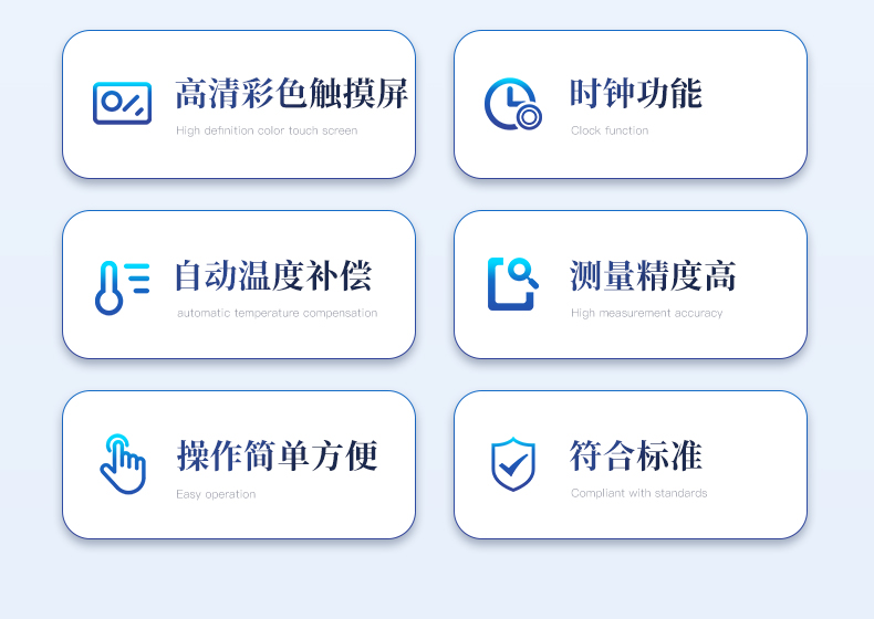 儀器采用等一點(diǎn)標(biāo)定,簡(jiǎn)單方便,保證測(cè)量精度;自動(dòng)溫度補(bǔ)償;動(dòng)態(tài)張力曲線顯示;時(shí)鐘功能,掉電存儲(chǔ)功能;高清晰彩色觸摸屏,操作更加方便;