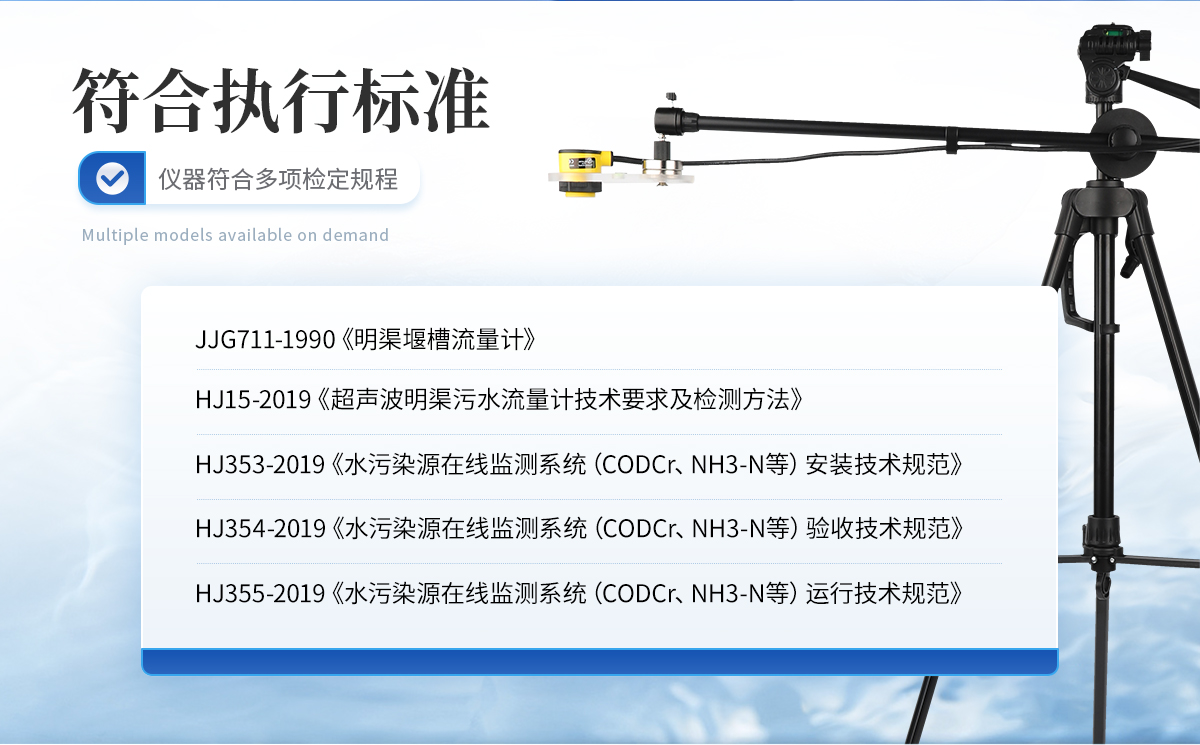 JJG711-1990《明渠堰槽流量計》;    HJ15-2019《超聲波明渠污水流量計技術要求及檢測方法》;    HJ353-2019《水污染源在線監測系統(CODCr、NH3-N等)安裝技術規范》;    HJ354-2019《水污染源在線監測系統(CODCr、NH3-N等)驗收技術規范》;    HJ355-2019《水污染源在線監測系統(CODCr、NH3-N等)運行技術規范》;