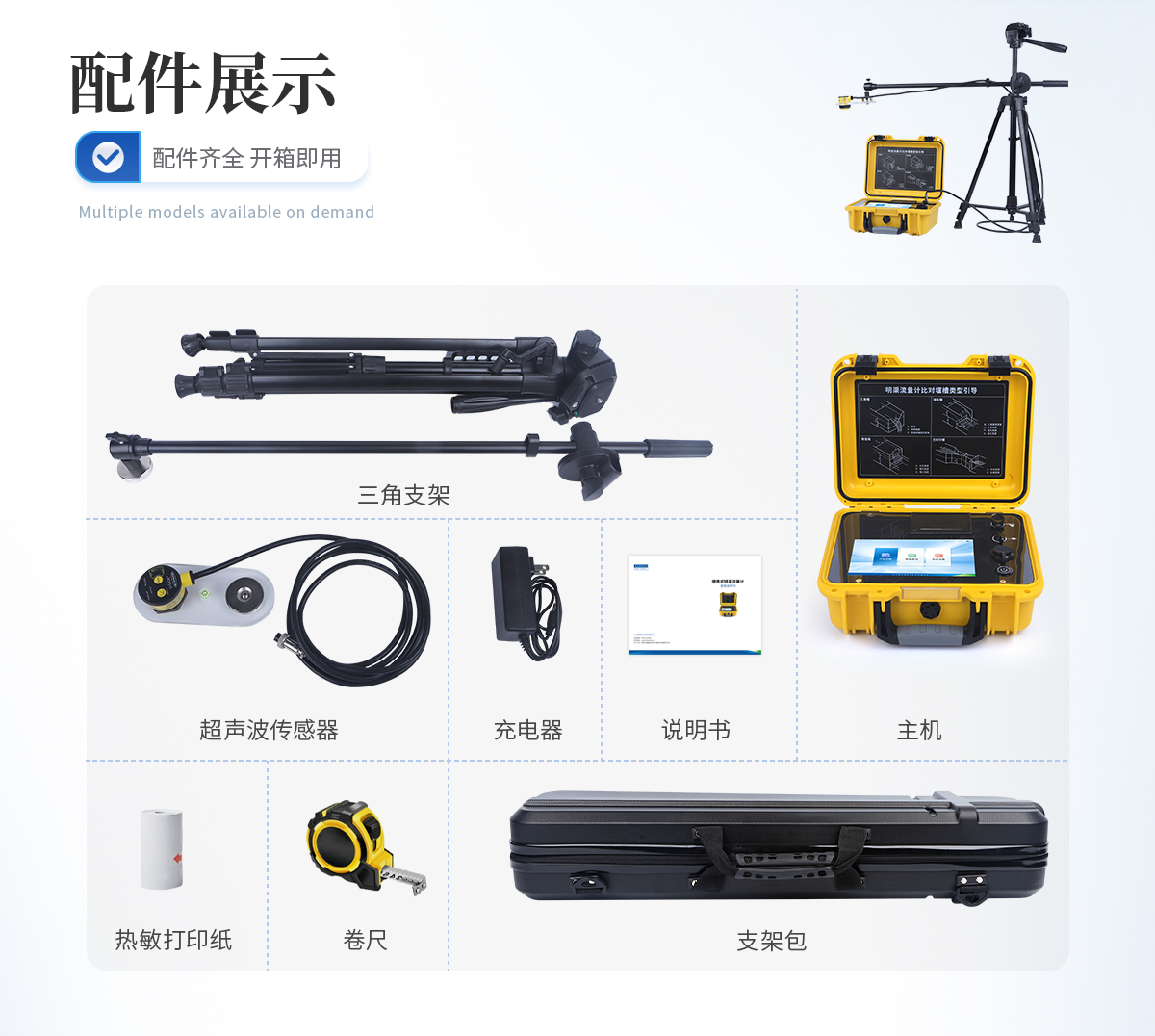 1.流量測量范圍:0~40m3/s;    2.液位測量范圍:10cm~1m;    3.流量測量誤差:≤±1%;    4.液位測量誤差:±0.5mm;    5.內置電池規格:12.6V/4.8Ah,待機時間>48小時;    6.外部充電器規格:12.6V/2A;    7.數據輸出方式:USB;    8.數據打印:內置熱敏打印機;    9.定位方式:標配GPS定位;    10.工作環境溫度:-20~50℃    11.主機尺寸:274*225*113mm;    12.三腳架尺寸:700*200*130mm;    13.整機重量:6.6kg(含三腳架、傳感器);