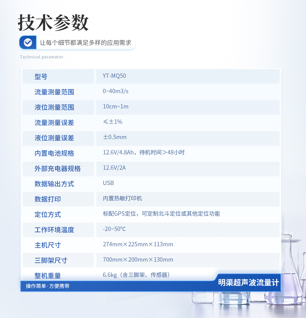型號:YT-MQ50 產品簡介:便攜式明渠流量計是專為水文監測、江河流量監測、農業灌溉及市政給排水等行業設計的一種高精度測量儀表,它采用超聲波技術和特殊的微功耗設計方案,結合全數字信號處理技術,確保了測量的穩定性與可靠性。···   更新時間:2026-03-14