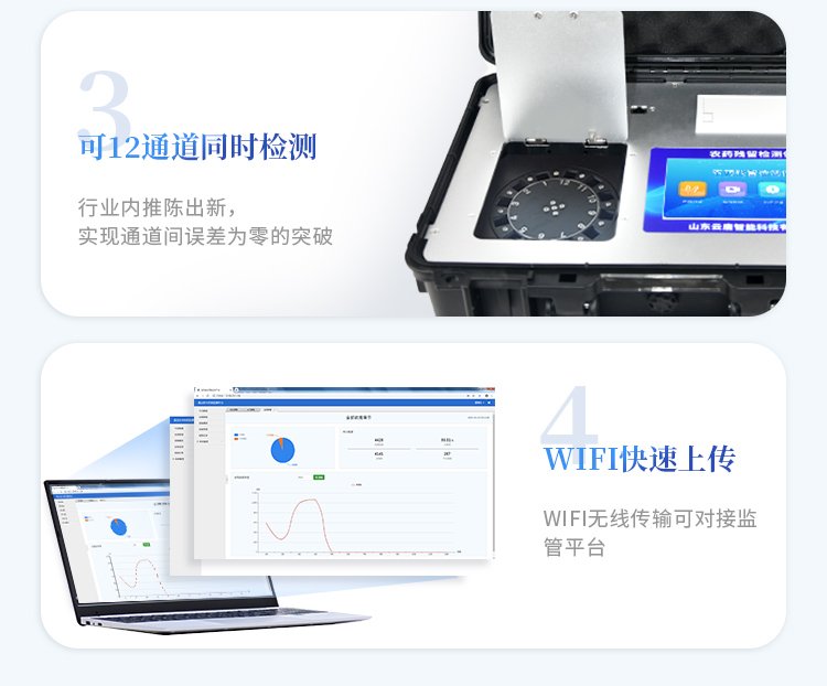 | 安卓智能操作系統,采用更加**和人性化操作,儀器具有無線聯網上傳功能,快速上傳數據,進行數據統計和分析。 | 智能化程度高,儀器具有自檢功能:具有開機自檢和調零功能,具有自動檢測重復性功能;同時,檢測完成可自動打印檢測報告和二維碼。手機掃碼可顯示出詳細檢測信息。 | 儀器帶有監管平臺,數據可局域網和互聯網數據上傳,檢測結果直接傳至食品安全監管平臺。進行區域食品安全監管及大數據分析處理與數據統計,檢測區域食品安全長短期動態,達到食品安全問題預估、預警 。 | 樣品處理簡單省力,整體操作快速、安全、便捷。 | 儀器具有自身保護功能,可設置用戶名及密碼,防止非工作人員操作等。 | 內置強大的數據庫,可在儀器上直接選擇樣品名稱、檢測指標、送檢單位等信息,也可在儀器上直接編輯錄入樣品名稱、檢測指標、送檢單位等信息并保存進樣品數據庫,方便后期操作調取使用。 | 儀器具有重新校準、鎖定、恢復出廠設置功能。 |