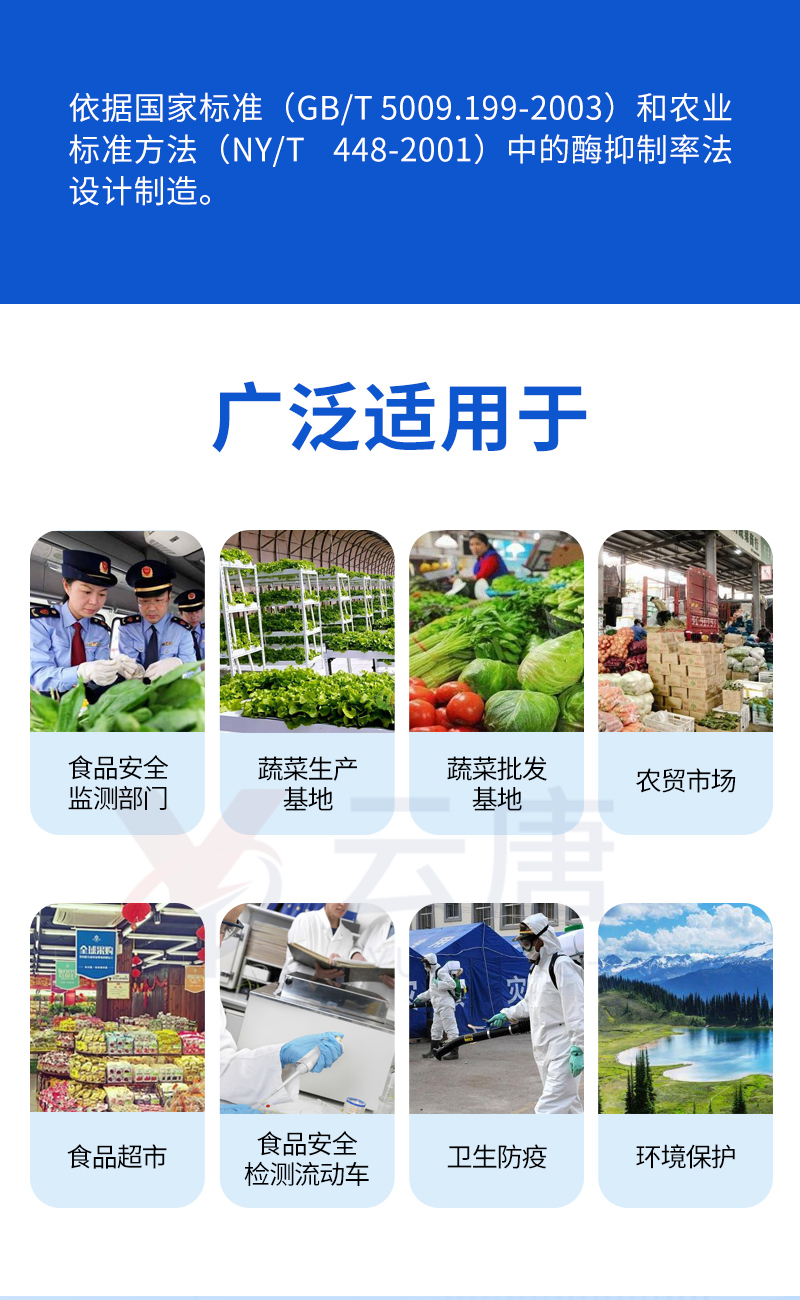 該儀器依據(jù)國家標(biāo)準(zhǔn)(GB/T 5009.199-2003)和農(nóng)業(yè)標(biāo)準(zhǔn)方法(NY/T 448-2001)中的酶抑制率法設(shè)計制造,能準(zhǔn)確、快速檢測出蔬菜、水果、農(nóng)產(chǎn)品、茶葉等固體或液體中有機(jī)磷和氨基甲酸酯類農(nóng)藥殘留量。廣泛適用于各級食品安全監(jiān)測部門、蔬菜生產(chǎn)基地、蔬菜批發(fā)基地、農(nóng)貿(mào)市場、食品超市、各單位食堂、食品安全檢測流動車、衛(wèi)生防疫、環(huán)境保護(hù)等領(lǐng)域。