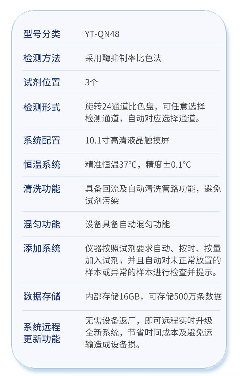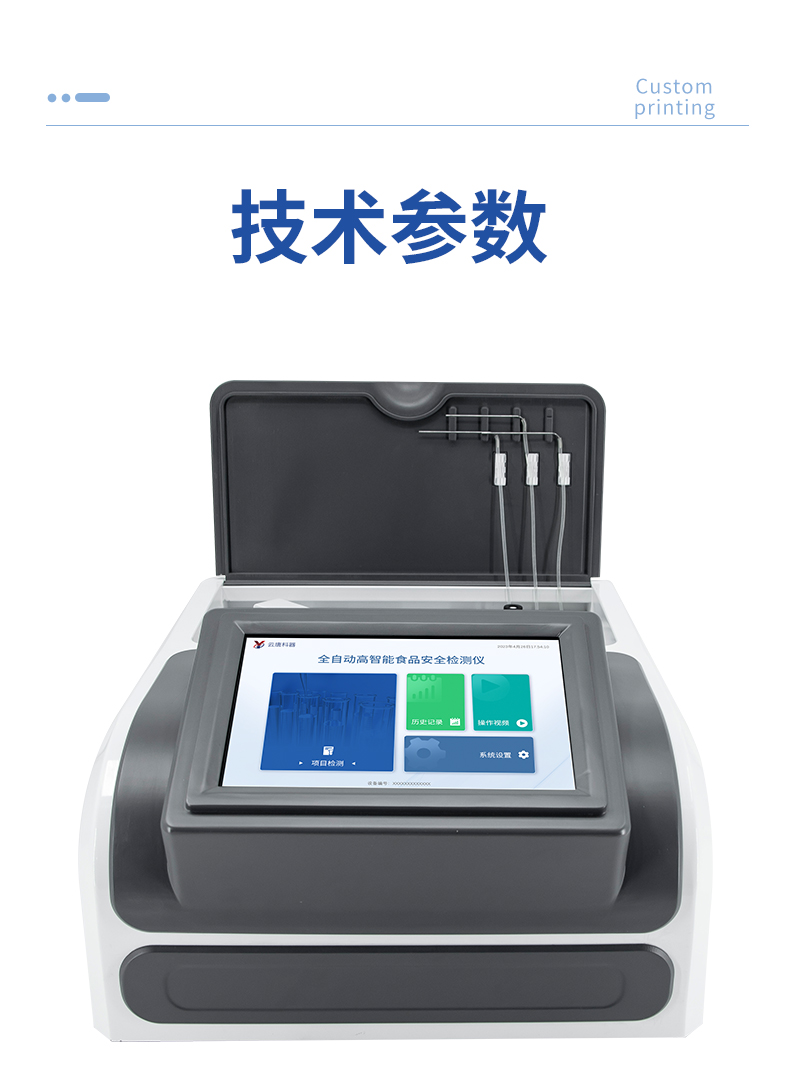 1. 試劑位置:3個2. 檢測形式:旋轉48通道比色盤,可任意選擇檢測通道,自動對應選擇通道。3. 系統配置:10.1寸高清液晶觸摸屏,采用ARM Cortex-A7,RK3288/4核處理器,運行內存1GB。Android7.1.1 系統分辨率1280×800。4.恒溫系統:具有自動加溫溫控系統,精準恒溫37℃,精度±0.1℃。5.添加系統:儀器按照試劑要求自動、按時、按量加入試劑,并且自動對未正常放置的樣本或異常的樣本進行檢查并提示。 6.清洗功能:儀器具備回流及自動清洗管路功能,避免試劑污染。7.混勻功能:設備具備自動混勻功能。8.光源校準:設備可自動校準,確保檢測準確度。9.實時監控:儀器測試過程中屏幕顯示運行狀態,可實時查看。10.數據存儲:內部存儲16GB,可存儲500萬條數據。11.樣品多選功能:設備具備樣品一鍵多選功能,選擇樣品自動匹配檢測通道。12.項目預設:可提前設置單個及多個相同或不相同的檢測任務,可單次或者多次調取,減少檢測時間。13.自定義打印系統:內置自定義打印系統,可按需靈活設置開啟或關閉:產品合格證(國家農業部標準),二維碼,抽樣信息、檢測信息,受檢信息等信息的打印。14.A4版本報告打印功能:設備可自動生成A4版報告,A4報告帶二維碼,可掃描二維碼生成電子版,并可識別真偽。15.傳輸方式:儀器配備無線通信模塊: 4G(APN)通訊模塊、Wifi模塊,藍牙傳輸模塊,同時具有USB接口以及RJ45接口能以多種方式實現數據保存和數據傳輸功能,設備數據可以同步上傳至平臺。16.數據監管系統:設備自帶監管平臺,并可同步對接監管平臺,數據可局域網和互聯網數據上傳,檢測結果可直接傳至食品安全監管平臺。達到食品安全問題預估、預警。17.系統遠程更新功能:無需設備返廠,即可遠程實時升級全新系統,節省時間成本及避免運輸造成設備損。