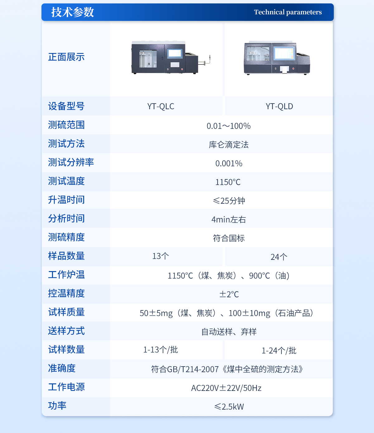 1.硫的測(cè)量范圍:0—40%.2.單個(gè)試樣燃燒分析時(shí)間:約5--7分鐘,其中在500℃處停留45秒,1050℃處停留4分45秒。3.控溫:精度±5℃。測(cè)溫:精度0.5級(jí);加熱體為硅碳管,高溫區(qū)長(zhǎng)度≥90毫米,溫度為1050℃±5℃(根據(jù)需要可調(diào)節(jié)溫度)4.精密度:如下表規(guī)定:St,%<1 1="">4重復(fù)性St,ad,% 0.05  0.10  0.20再現(xiàn)型St,d,%  0.10  0.20  0.305.升溫速度:20--25℃/分,約30分鐘可達(dá)1050℃。6.電解池:容積為450毫升,鉑電解電極面積150mm2 。7.供電電源:220(1±10%)V,50Hz.8.儀器尺寸(mm)  長(zhǎng)×寬×高(770×460×410)