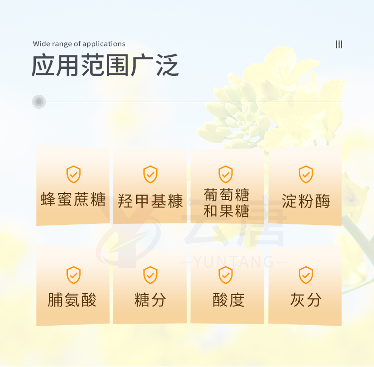 檢測項目:蜂蜜蔗糖、蜂蜜還原糖(葡萄糖和果糖)、蜂蜜羥甲基糠醛、蜂蜜酸度、蜂蜜中農藥殘留、蜂蜜淀粉酶值、蜂蜜中脯氨酸、蜂蜜水分、蜂蜜糖分、蜂蜜中灰分,應用范圍:應用于現場檢測蜂蜜蔗糖、葡萄糖和果糖、羥甲基糠醛、酸度、農殘、淀粉酶、脯氨酸、水分、糖分、灰分含量的蜂蜜快速檢測儀,可廣泛應用于各類蜂蜜品質的快速定量檢測。