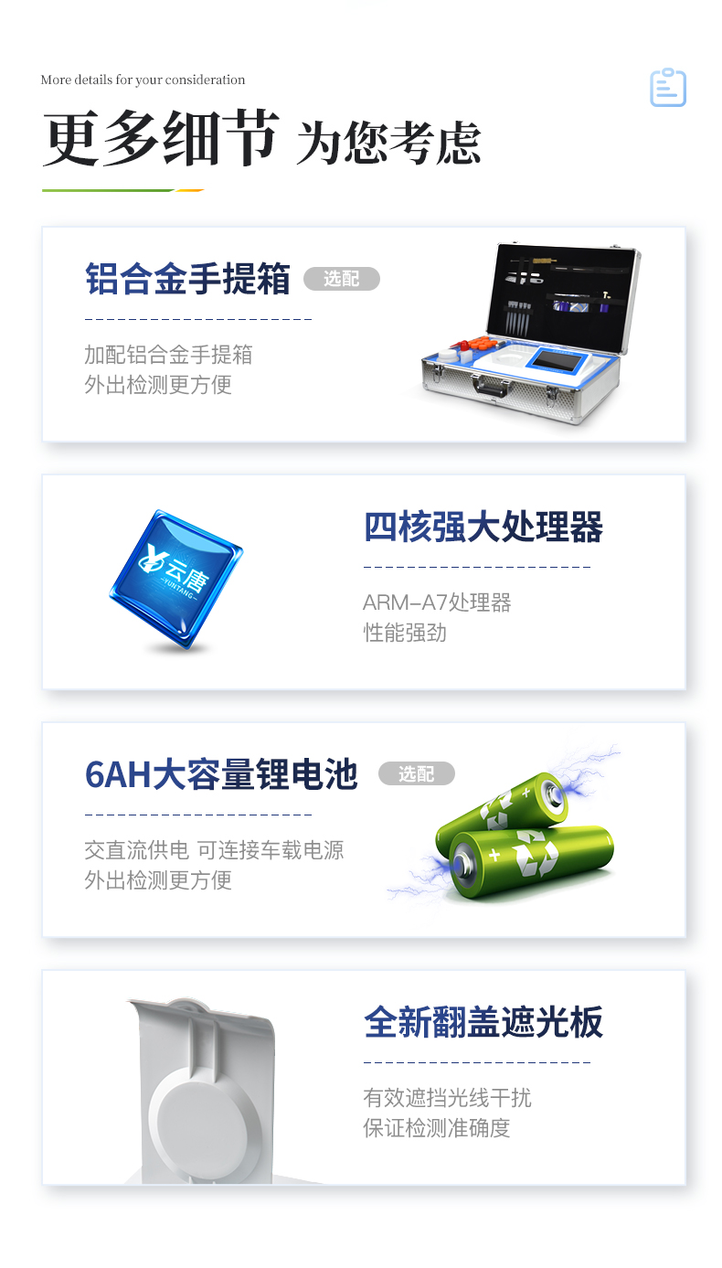 2、儀器檢測模塊標準化、智能化,檢測項目可隨意自由組合。檢測箱體內置多個標準檢測單元,檢測模塊可以調整配置。