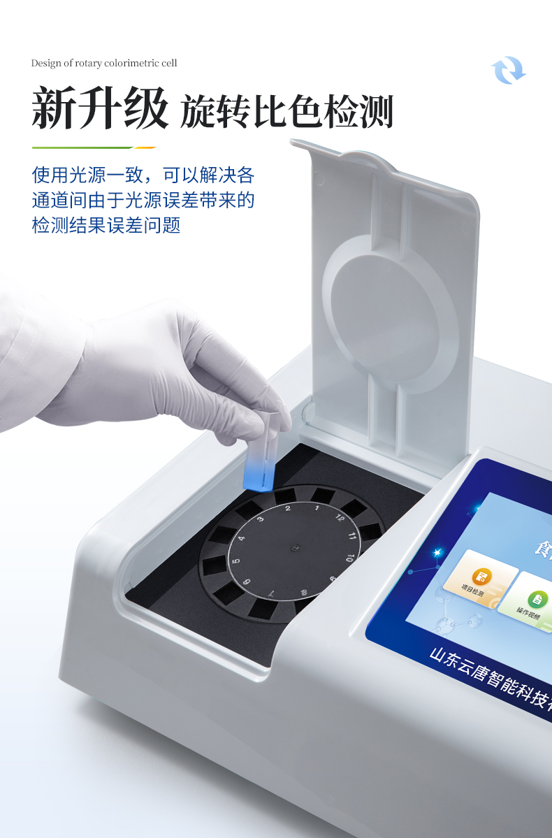 4、檢測通道:12通道;采用精密旋轉比色池設計,使用同芯片同光源校準精度,解決不同光源之間的誤差值,更加準確**。