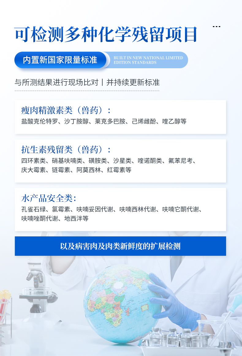 該獸藥殘留檢測(cè)儀適用于豬、雞、鴨、羊、牛、牛奶等畜禽肉產(chǎn)品中獸藥殘留,包括抗生素類殘留、瘦肉精激素類殘留和水產(chǎn)品有毒有害物質(zhì)的現(xiàn)場(chǎng)快速篩查定及性定量檢測(cè)。