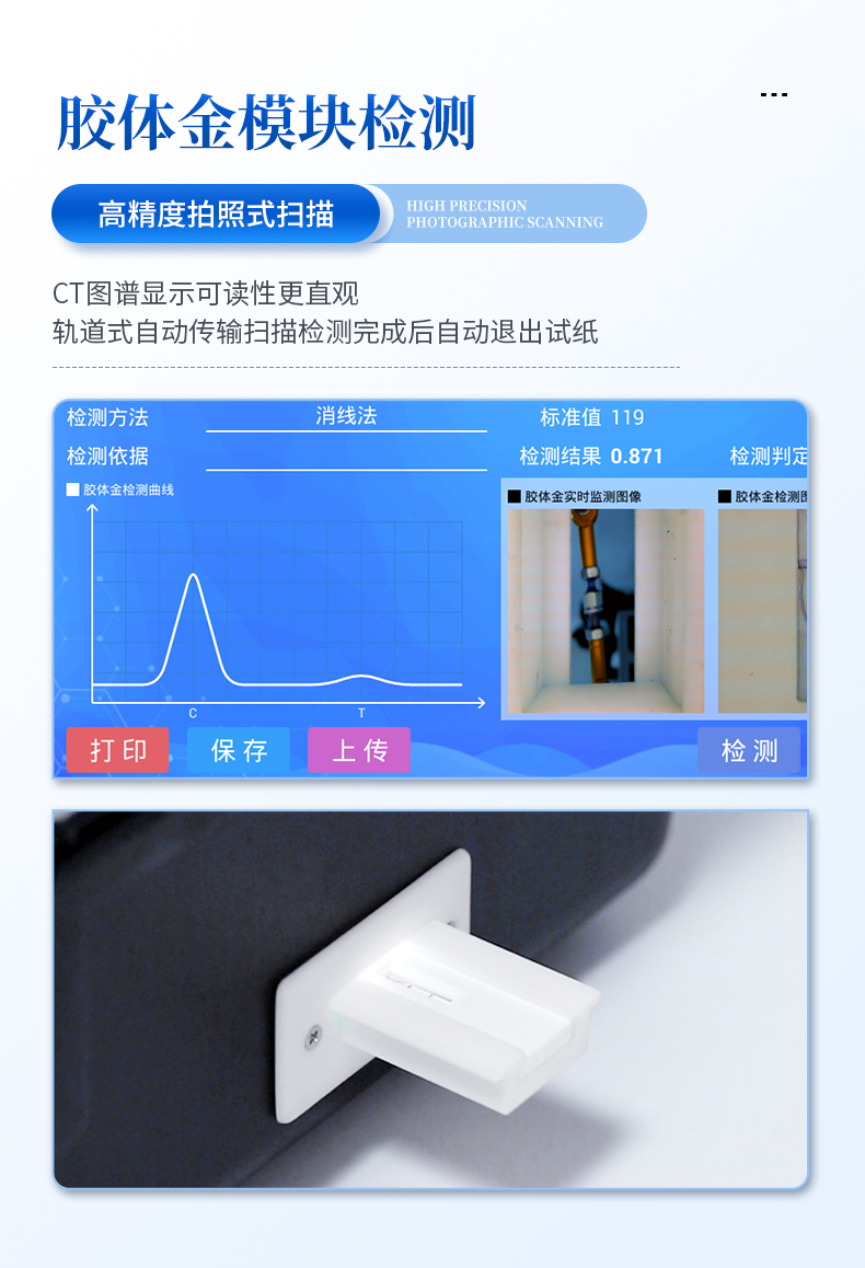7、膠體金模塊檢測(cè)方式:軌道式自動(dòng)傳輸掃描,檢測(cè)完成后自動(dòng)退出檢測(cè)卡。