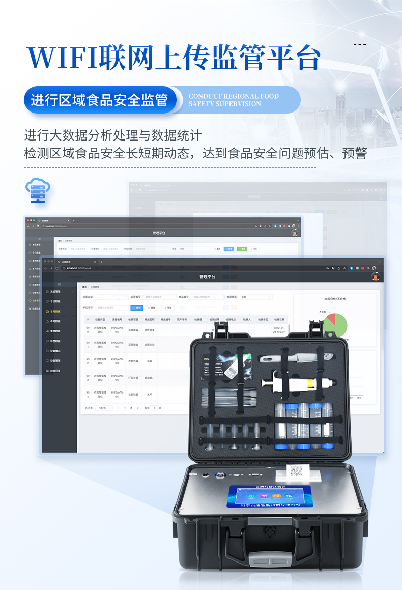 4、儀器帶有監(jiān)管平臺(tái),數(shù)據(jù)可局域網(wǎng)和互聯(lián)網(wǎng)數(shù)據(jù)上傳,檢測(cè)結(jié)果直接傳至食品安全監(jiān)管平臺(tái)。進(jìn)行區(qū)域食品安全監(jiān)管及大數(shù)據(jù)分析處理與數(shù)據(jù)統(tǒng)計(jì),檢測(cè)區(qū)域食品安全長(zhǎng)短期動(dòng)態(tài),達(dá)到食品安全問題預(yù)估、預(yù)警