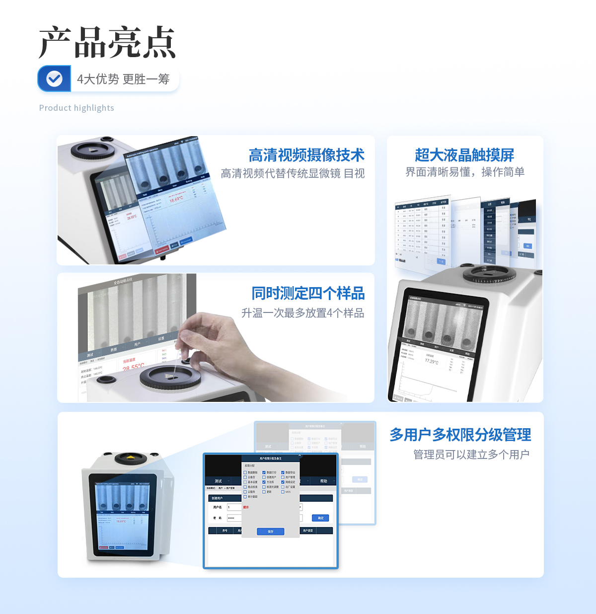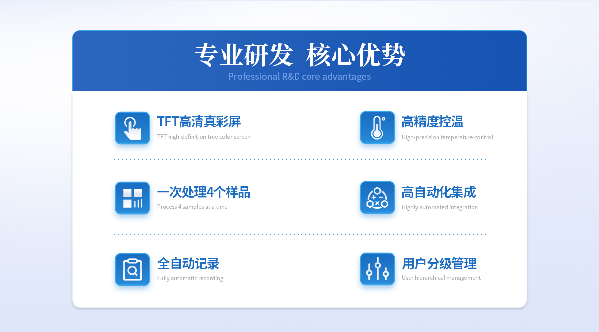 升溫一次*多放置4個樣品,與傳統測量方法相比工作效率提高4倍,且4組數據分別記錄實現對歷史數據的追溯,符合FDA 21CFR11確保出具報告的可信度。