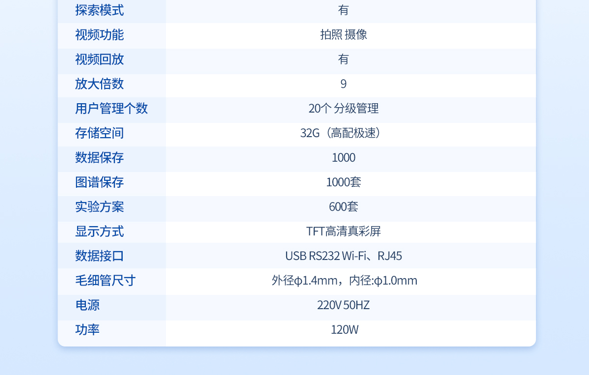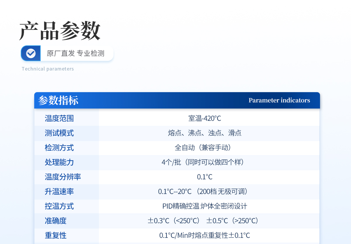 溫度范圍:   室溫-420℃檢測方式:   全自動(兼容手動)處理能力:   4個/批(同時可以做四個樣)溫度分辨率:0.01℃控溫方式:   PID**控溫 爐體全密閉設計準確度:       ±0.2℃(<200℃),±0.4℃(>200℃)加熱方式:電熱塊空氣加熱法升溫分辨率:≤0.1℃升溫速率::0.1℃/Min--20℃/Min準確度:±0.2℃(<200℃)、±0.4℃(>200℃)重復性:       0.1℃/Min時熔點重復性±0.1℃探索模式:   有視頻功能:   拍照 攝像視頻回放:   有放大倍數:   10用戶管理個數:500個以上,分四級管理數據保存:   800套實驗方案存儲:100套打 印 機:     通用型存儲空間:   128G(高配極速)顯示方式:   10寸TFT高清真彩屏數據接口:   USB RS232 Wi-Fi、RJ45毛細管尺寸: 外徑φ1.4mm,內徑:φ1.0m電源:220V  50HZ     功率:120W