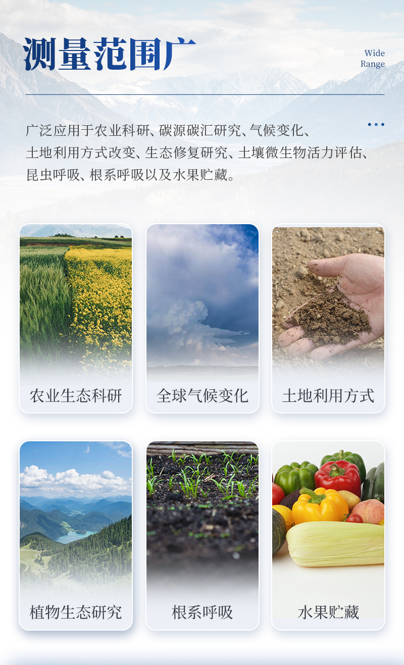 土壤呼吸是土壤生態系統碳素循環的一個重要過程,是土壤碳素同化異化平衡作用的結果,也是碳素由陸地生態系統返回大氣的主要途徑,是土壤中生命活動的表征,準確測定其釋放量是評價生態系統中生物學過程的關鍵;通過對土壤呼吸及其相關參數的監測,可估測根系和土壤微生物對氣候變化的響應。土壤CO2通量在時間和空間上受多種復雜物理和生物過程影響,長期、連續、準確的測量土壤碳通量,對陸地生態系統碳通量研究具有重要的意義。土壤呼吸測定儀可以同時顯示呼吸室內部的CO2濃度、溫度和濕度變化以及外部光合有效輻射強度。廣泛應用于農業生態科研、碳源碳匯研究、全球氣候變化、土地利用方式改變、生態修復研究、土壤微生物活力評估、植物生態研究、昆蟲呼吸、根系呼吸以及水果貯藏。