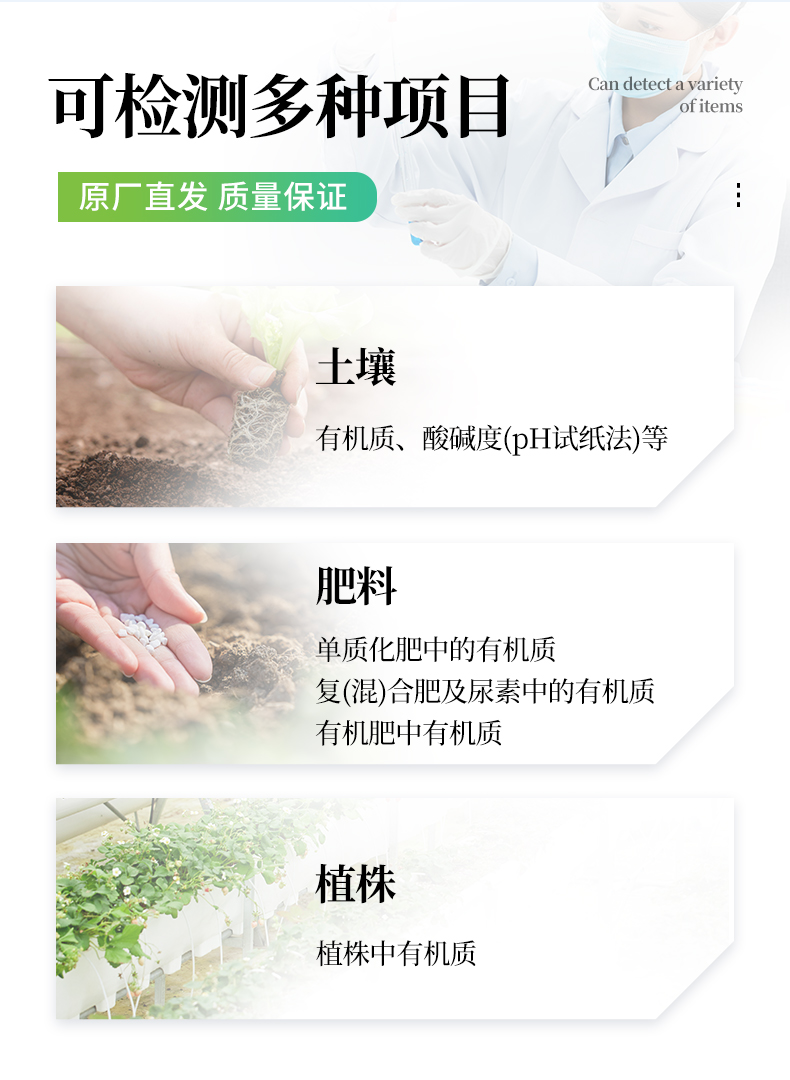 ★可檢測土壤及化肥、有機肥、植株中的有機質含量,土壤酸堿度,含鹽量(擴展)。