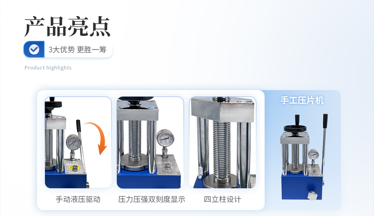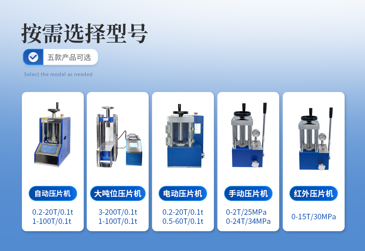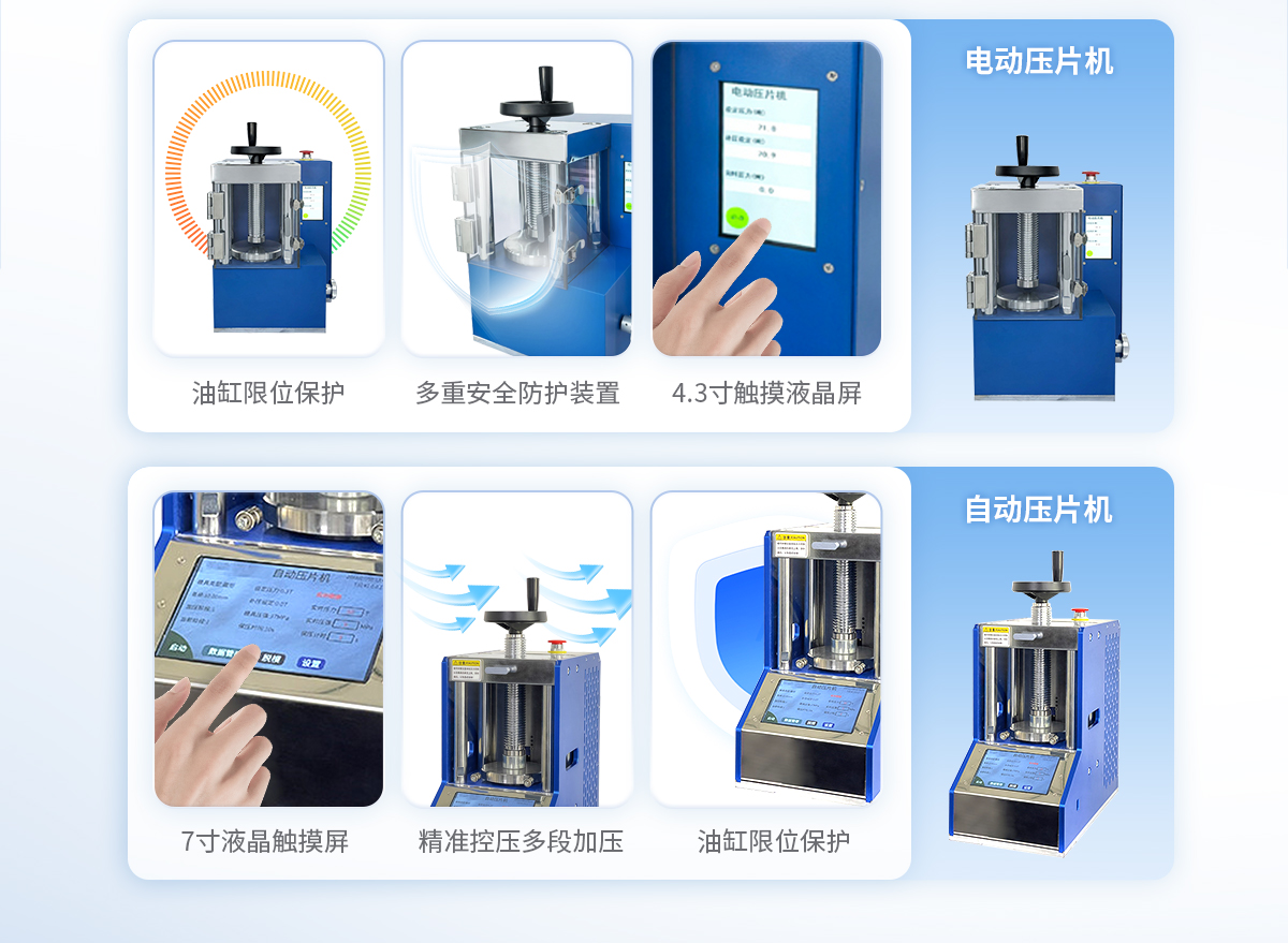該機采用四立柱設計,配上特定模具,可與鈣鐵分析,紅外光譜(IR), X熒光(XRF)等分析儀配套使用;廣泛應用于超導、電池、粉末冶金、**陶瓷、建材水泥、化工制藥等研發領域。