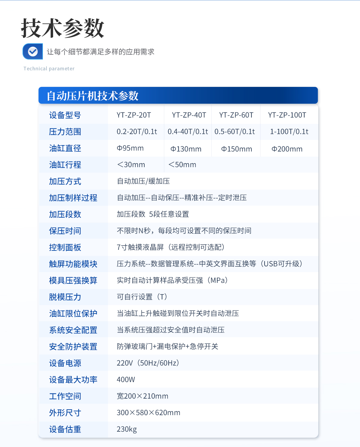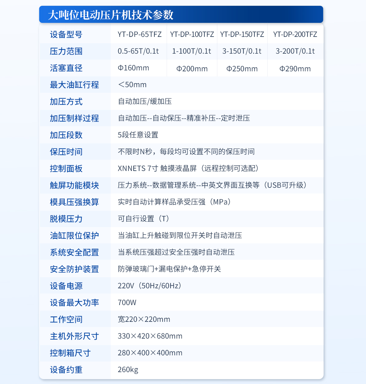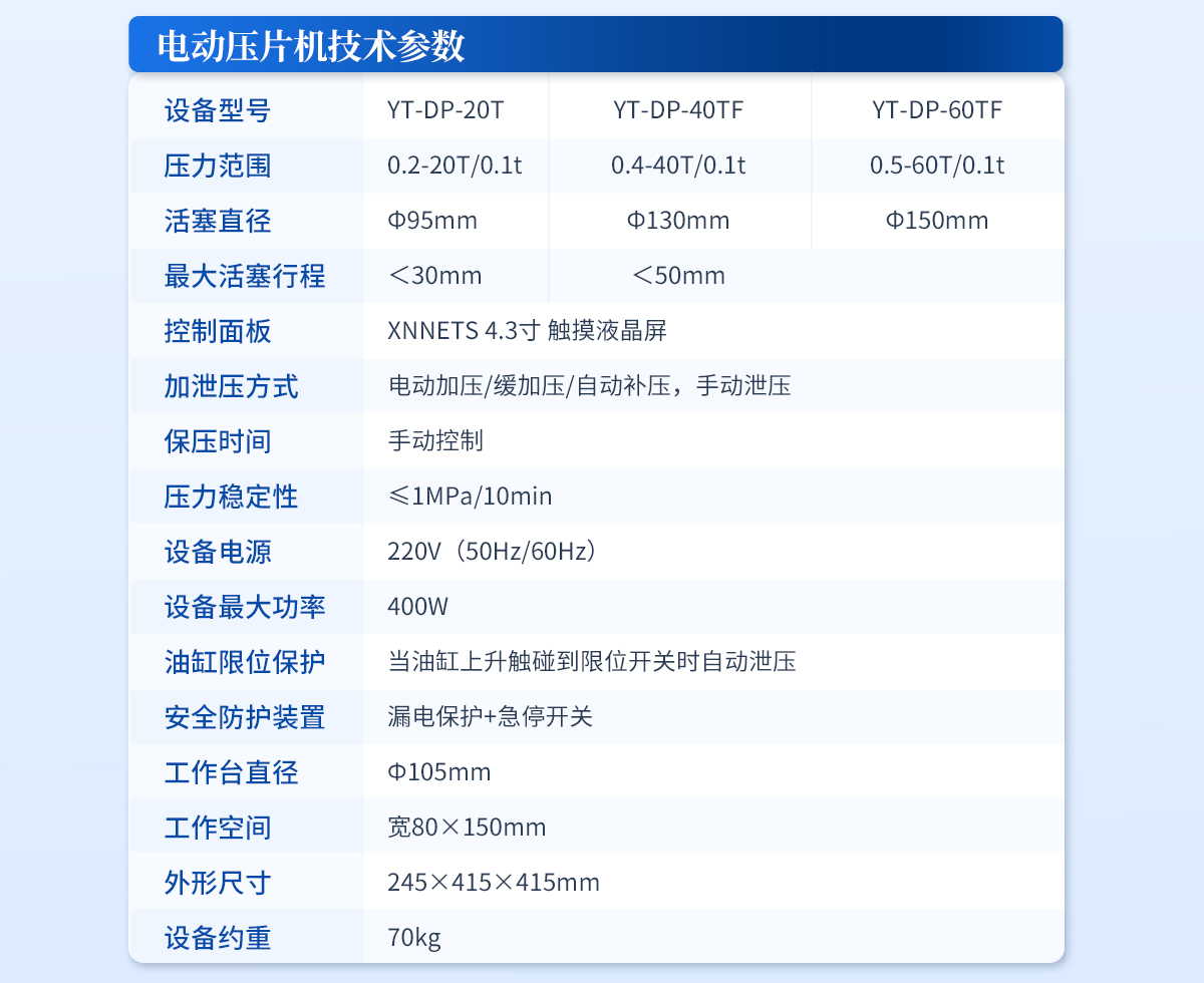 該機采用四立柱設計,配上特定模具,可與鈣鐵分析,紅外光譜(IR), X熒光(XRF)等分析儀配套使用;廣泛應用于超導、電池、粉末冶金、**陶瓷、建材水泥、化工制藥等研發領域。