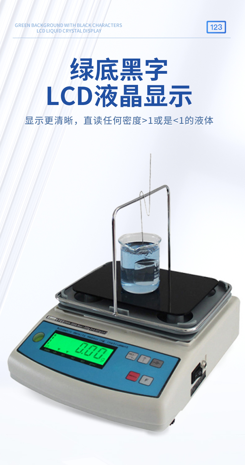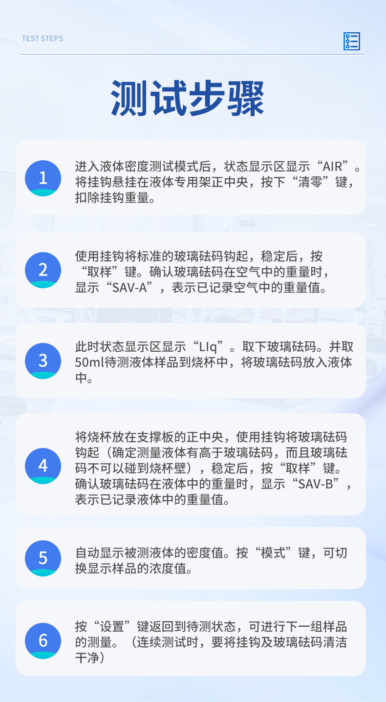 | 1、進(jìn)入液體密度測試模式后,狀態(tài)顯示區(qū)顯示“AIR”。 將掛鉤懸掛在液體專用架正中央,按下“清零”鍵,扣除掛鉤重量。 | 2、使用掛鉤將標(biāo)準(zhǔn)的玻璃砝碼鉤起,穩(wěn)定后,按“取樣”鍵。確認(rèn)玻璃砝碼在空氣中的重量時,顯示“SAV-A”,表示已記錄空氣中的重量值。 | 3、此時狀態(tài)顯示區(qū)顯示“LIq”。取下玻璃砝碼。并取50ml待測液體樣品到燒杯中,將玻璃砝碼放入液體中。 | 4、將燒杯放在支撐板的正中央,使用掛鉤將玻璃砝碼鉤起(確定測量液體有高于玻璃砝碼,而且玻璃砝碼不可以碰到燒杯壁),穩(wěn)定后,按“取樣”鍵。確認(rèn)玻璃砝碼在液體中的重量時,顯示“SAV-B”,表示已記錄液體中的重量值。 | 5、自動顯示被測液體的密度值。按“模式”鍵,可切換顯示樣品的濃度值。 | 7、按“設(shè)置”鍵返回到待測狀態(tài),可進(jìn)行下一組樣品的測量。(連續(xù)測試時,要將掛鉤及玻璃砝碼清潔干凈) | 儀器尺寸:195*220*190mm | 包裝尺寸:430*200*360mm | 包裝重量:4kg | 測試時間:約5秒 顯示值: 密度、體積 溫度補(bǔ)償: 溶液溫度可設(shè)定至0~100℃ 溶液補(bǔ)償: 溶液可設(shè)定至19.999 |